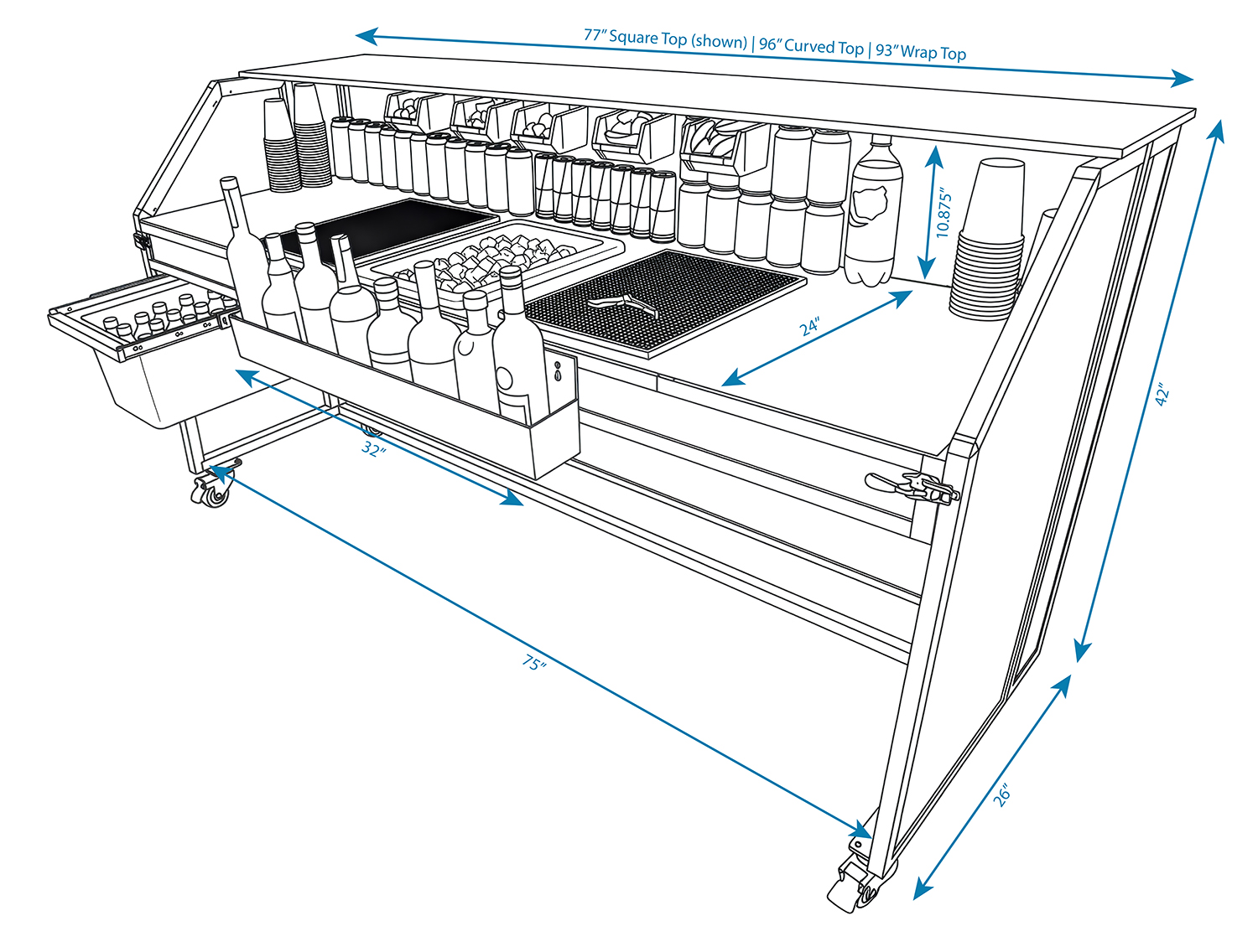 Fabricado en aluminio ligero y duradero, el Summit 77 pesa sólo 120 libras, lo que lo hace muy manejable para los equipos de eventos que mueven el equipo constantemente. Es una opción estratégica para grandes recintos, equipos de catering y ferias comerciales en los que se necesita la máxima capacidad sin el coste de un montaje permanente. Como se monta y desmonta con tanta rapidez, también es la solución perfecta. bar satélite de gran volumen para restaurantes y hoteles que desean añadir sobre la marcha una estación de bebidas profesional a un patio, vestíbulo o espacio para eventos de temporada.